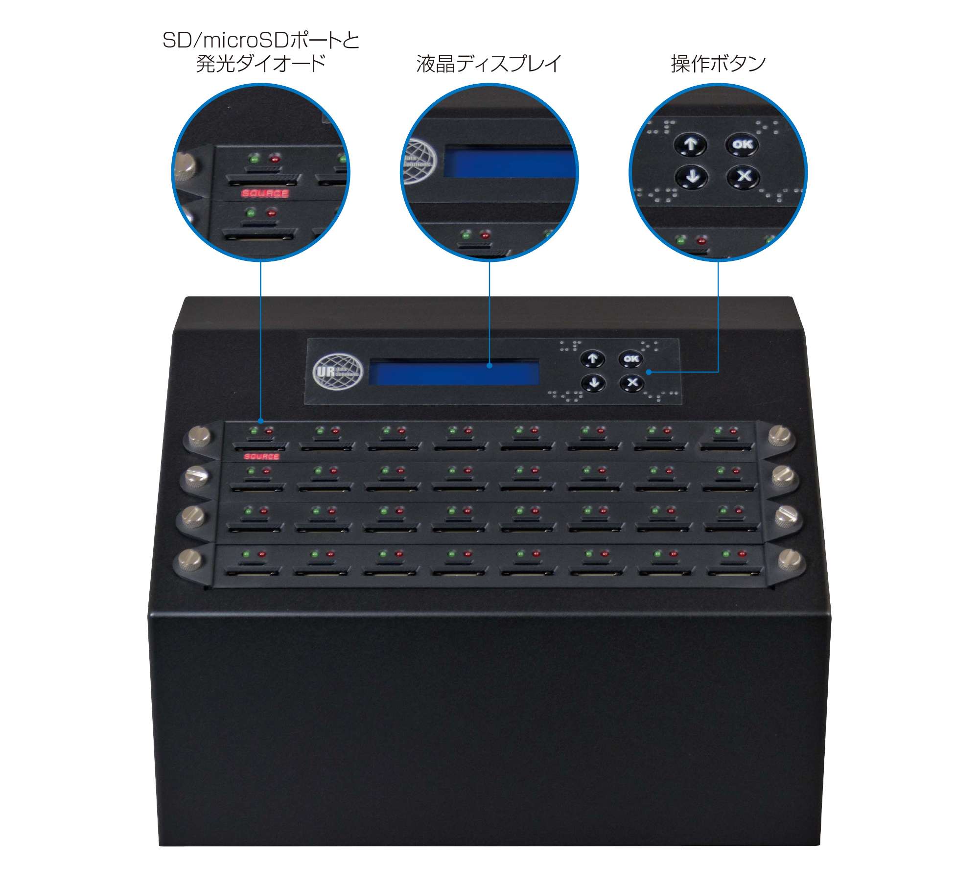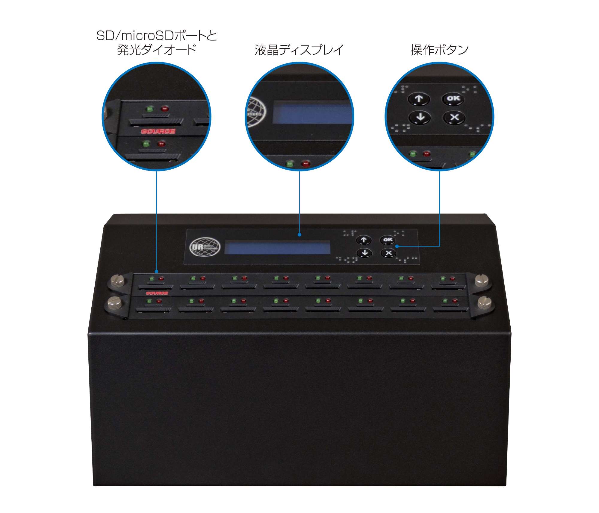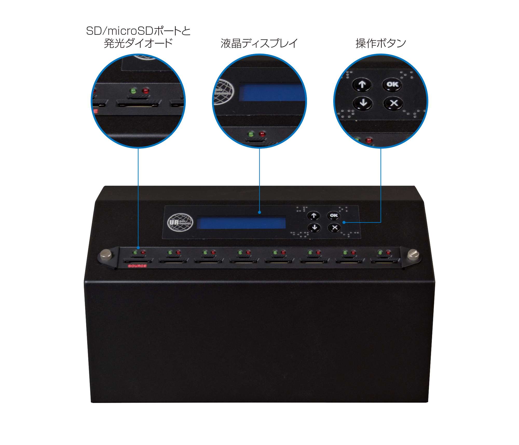 Intelligent 9 S3シリーズ SD/microSDデュプリケーター/消去装置は、SD/microSDカードの高速・簡単・便利なコピーを実現します。最新のSD 3.0規格に対応し、ネイティブ信号方式を採用したコピー・消去機能を搭載しています。コンパクト設計と効率的なユーザーインターフェースにより、PCを介さずに複数のSD/microSDカードに遅延や煩わしさなくコピーできます。1枚のコピー元カードから全コピー先カードへ最大8GB/分の転送速度でコピーが可能です。コピーのたびに機器をリセットする必要はなく、カードを差し替えるだけで連続作業が行えます(プラグ&ゴー)。